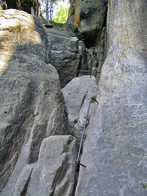 Möglicherweise, wie die Starke Stiege als Schnellaufstieg zum Roßsteig oder den Klettergipfeln gedacht, führt sie durch diese enge Felskluft. Mit Rucksack auf dem Rücken nicht zu bewältigen! Für "Riesen" also nicht zu empfehlen. Leider sind immer wieder Spuren absichtlicher Entfernung von Steighilfen zu erkennen.